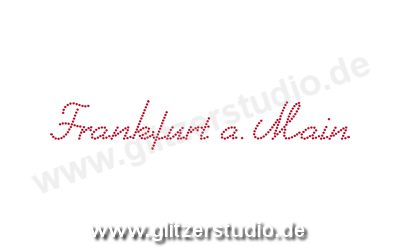 Städte Namen Frankfurt am Main mit leuchtenden Strass. Die Strassstein Motive verfügen über eine Klebebeschichtung, welche bei einer Temperatur von ca. 120 °C schmilzt und mit dem darunterliegenden Stoff Waschfest verbindet.